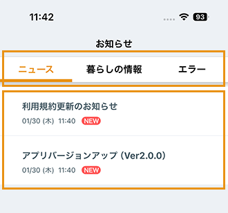 アプリからのお知らせ、PUSH通知で配信済みの暮らしに役立つ情報、給湯器で発生したエラーの内容と対処方法を確認できます。