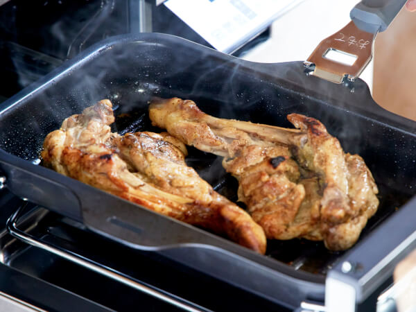 ラ・クックグランは内面の黒色セラミック塗装により遠赤外線効果があるのが特長です。だから、ふた付きでもきれいな焼き目がつくうえに、炭火焼のようにジューシーに仕上げます。その遠赤外線効果は、従来のガスコンロ両面焼きグリルバーナー(当社製品)より約9%※ もその効果が高いことが実証されています。