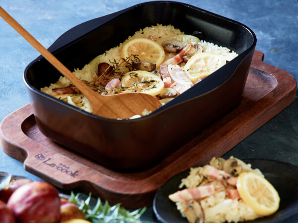 シリコン樹脂加工だから油なしでも食材がくっつきにくく、後片付けがラクに。ふたがあるラ・クックグランポットだから安心して使えます。